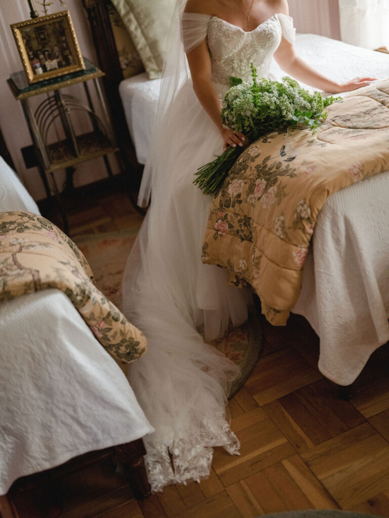 The bride sits on the edge of a vintage bed, bouquet in hand, gazing toward the window as warm afternoon light fills the room.
