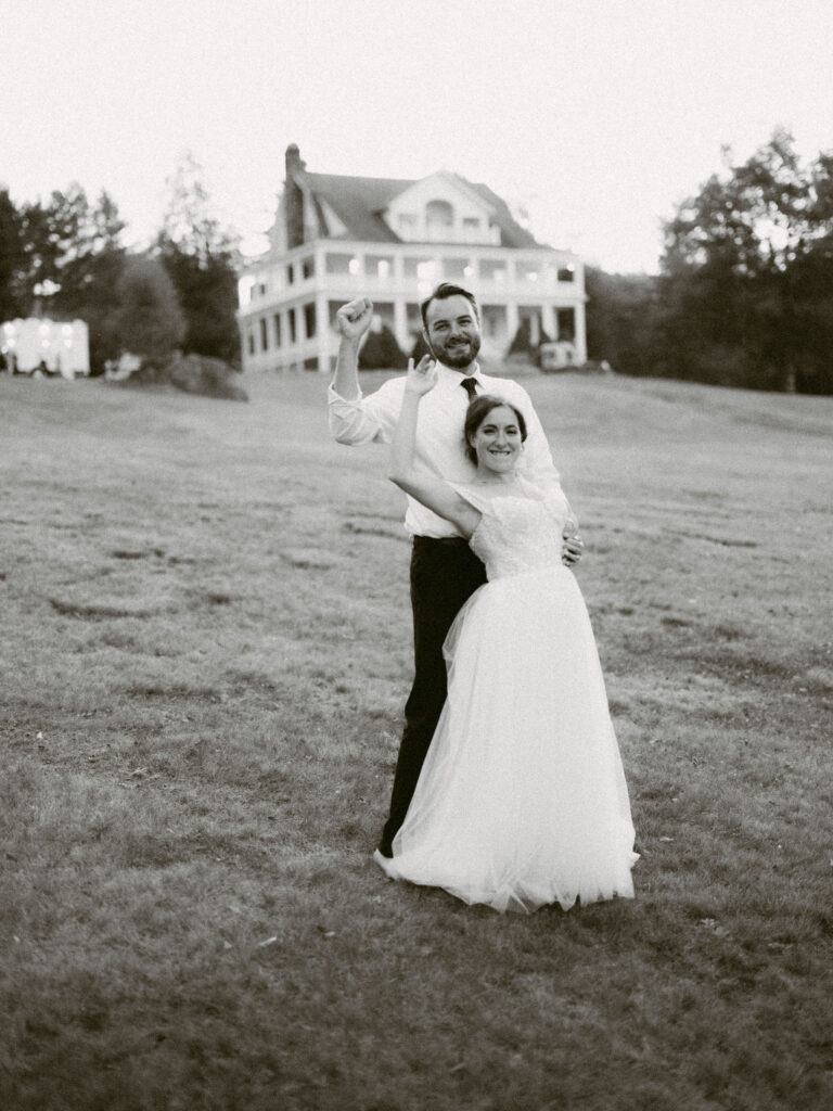 Bride and groom cheering under the reception tent during their Speculator, NY wedding celebration.